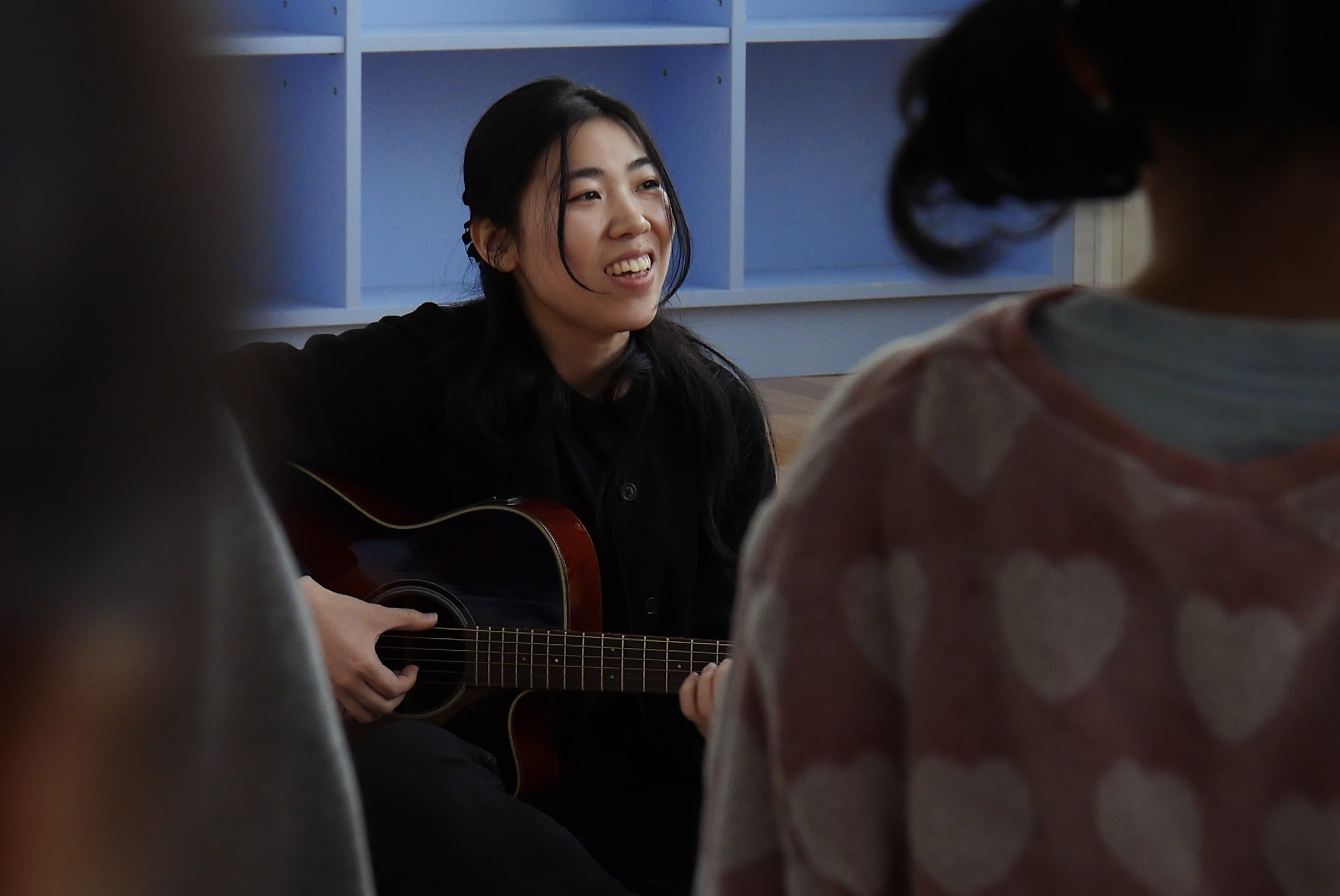 2、3階の広場での弾き語りが始まると、近くの教室から出てきた子や廊下にいた子がHIKARIさんを取り囲みます。