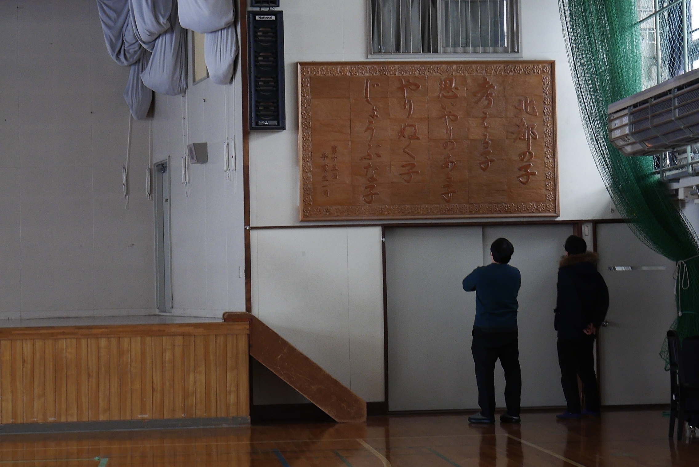 あるタイミングで、木製の巨大標語パネルに近づきます。その次は校歌の巨大パネルへ。