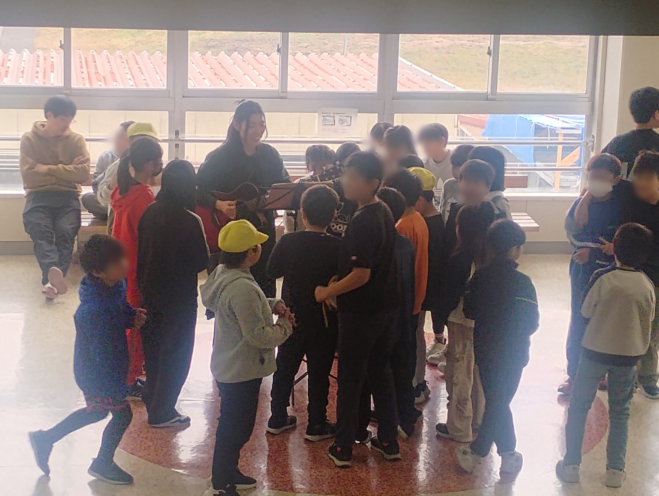 撮影はモルックコートが作られた中庭で行いました。中休み、子ども達のしゃべり声やモルックのピンが当たる音が響いて気持ちよかったので、ここでやりたいなーと思っていたのでここにしました。見上げると空があり、声が反響して空に抜けていく感じが心地よかったです。撮影後、窓ガラス越しに聴いてくれていた子ども達がわらわらと来てくれて、リクエストをもらったりギターに触れてみる会を開いたりと、一緒に音楽を楽しみました。