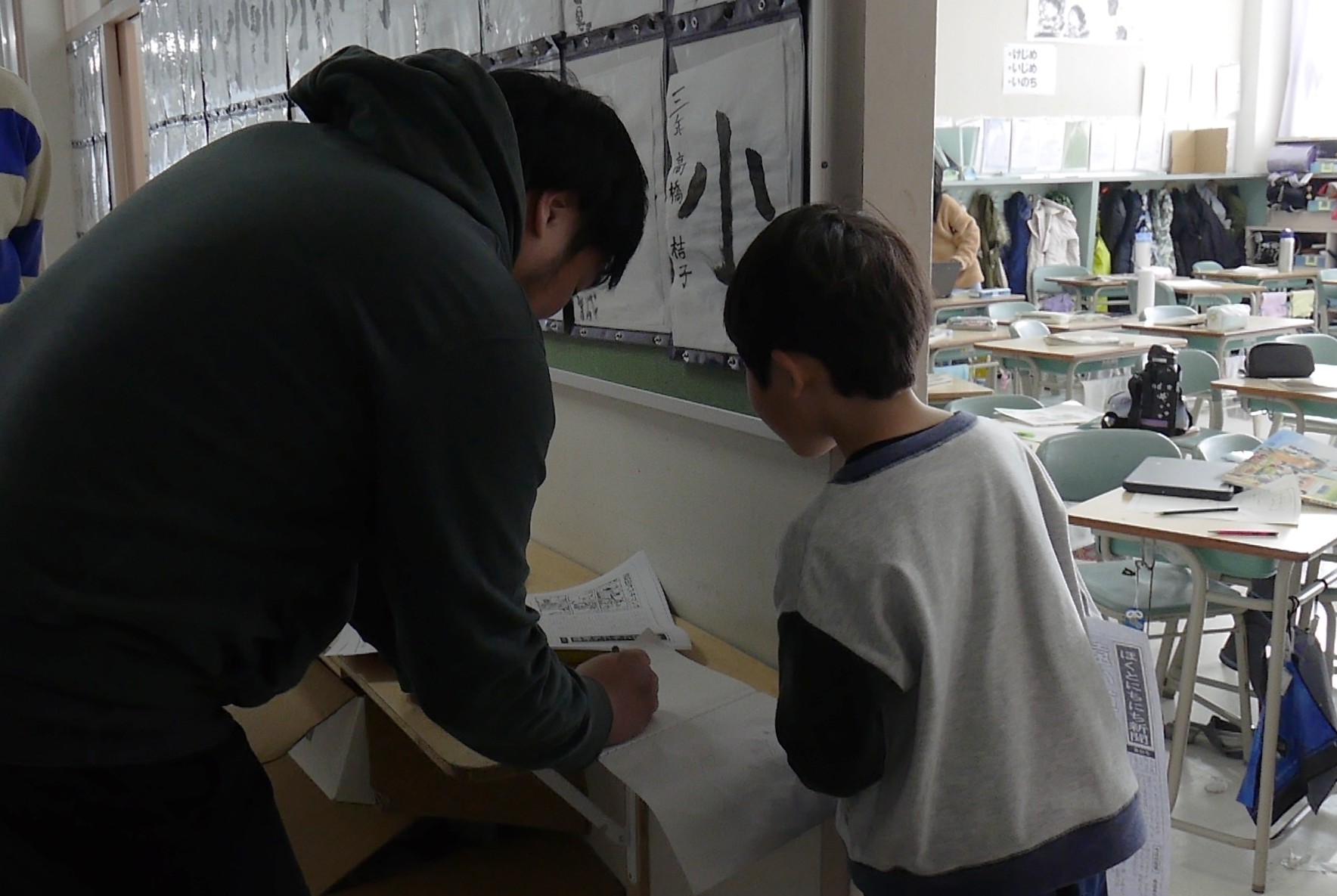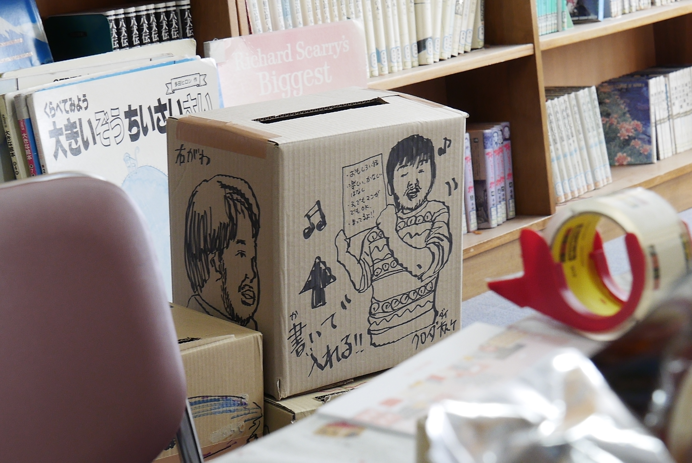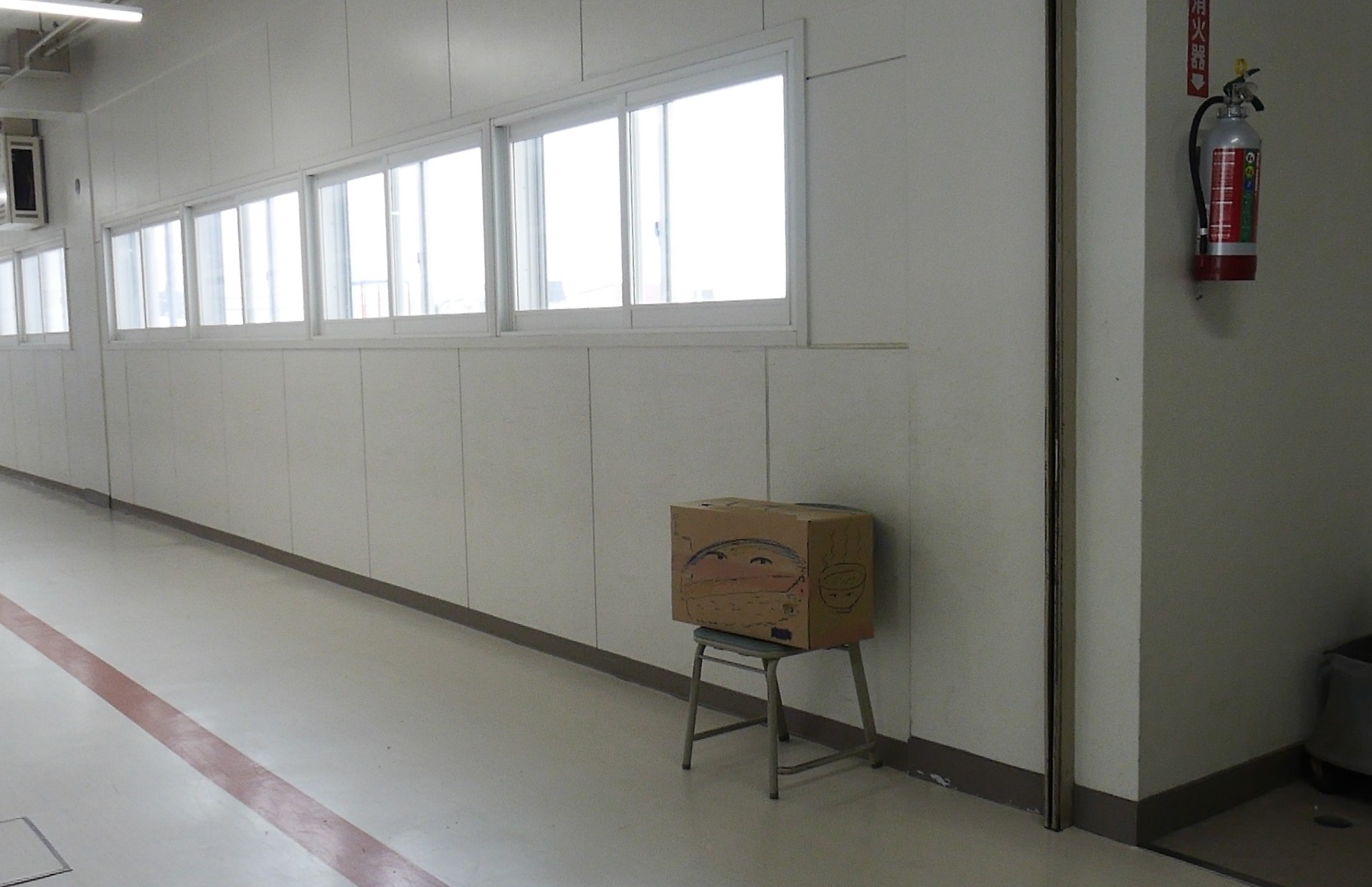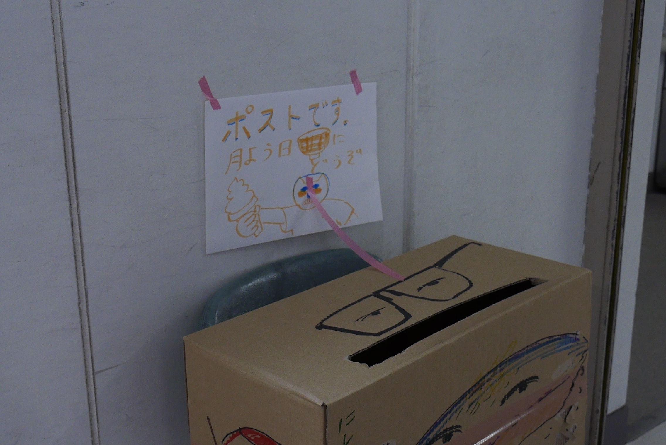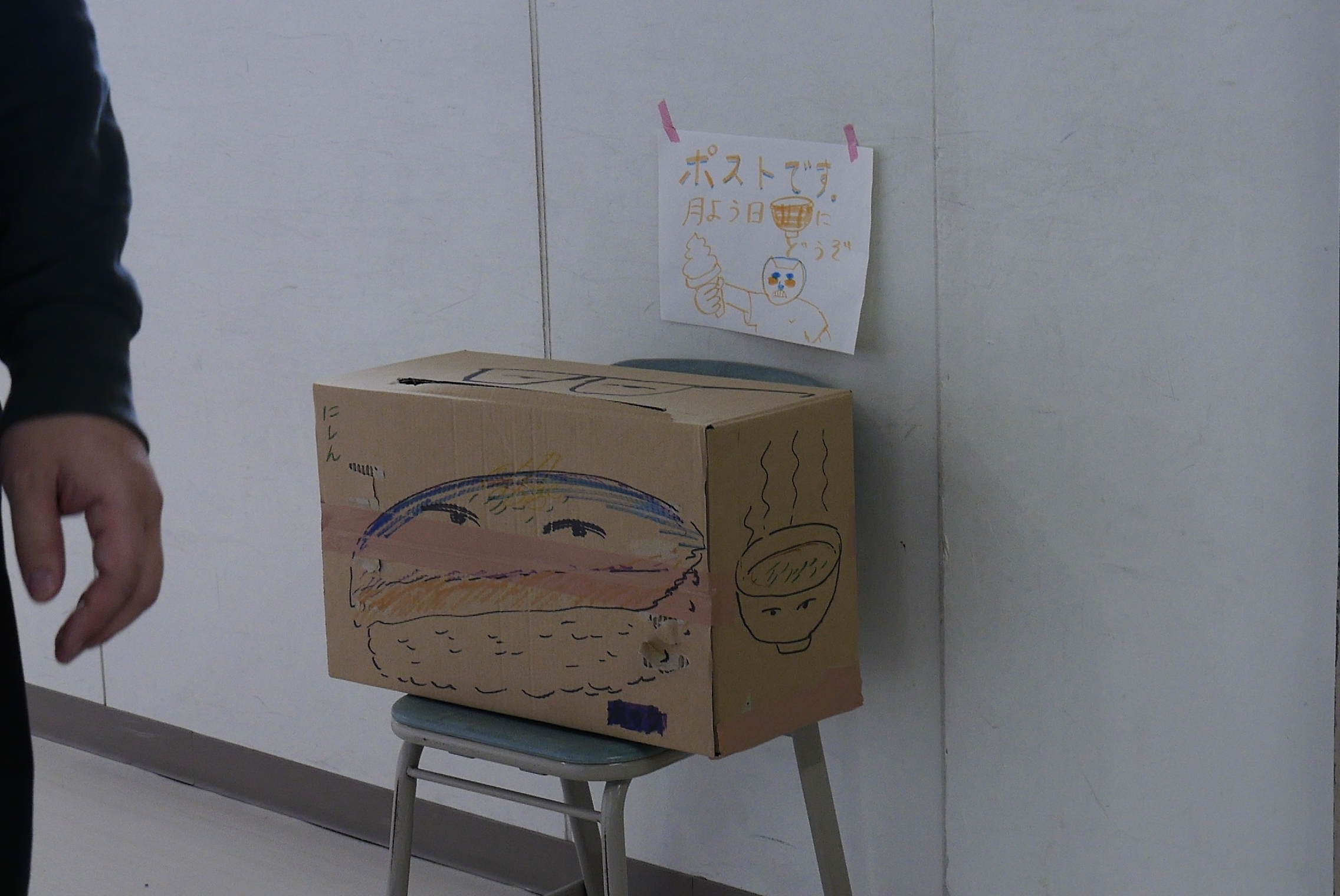 「たのしいこと、かなしいこと、おもしろいこと、こわいこと、つたえたいことを、絵でもなんでもいいのでここにかいて、がっこうの各階にあるポスト(ダンボールばこ)に入れてください」。