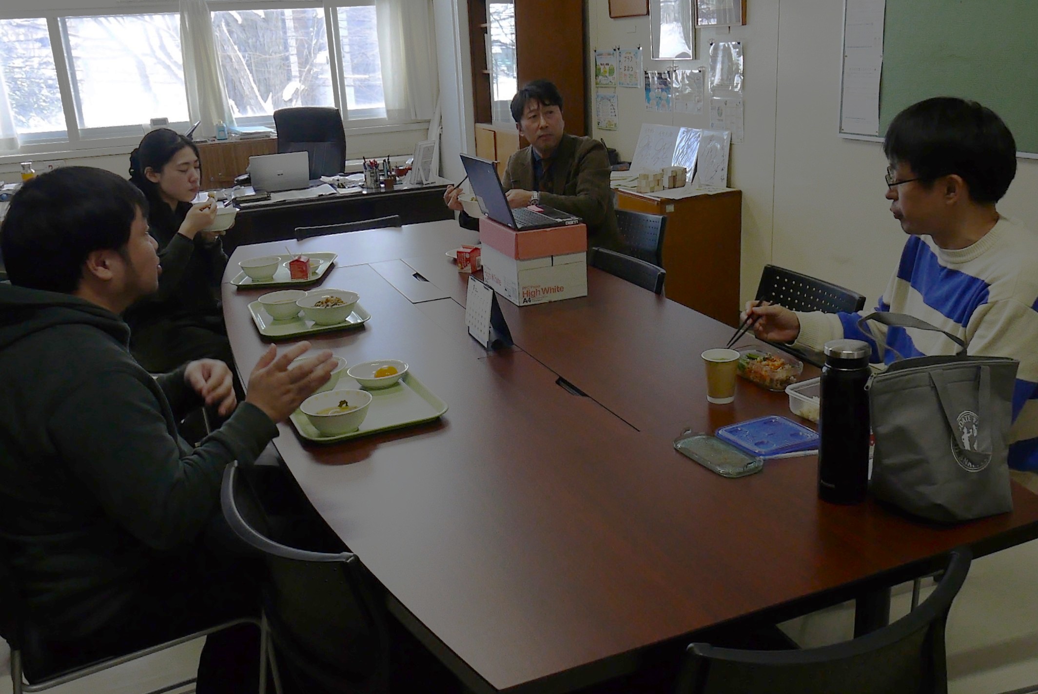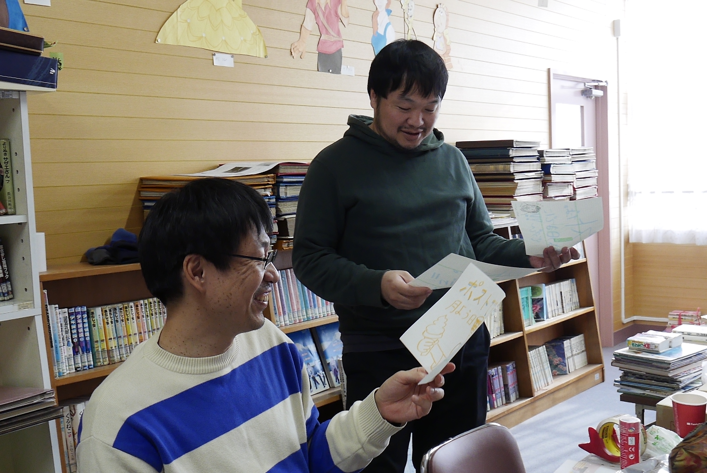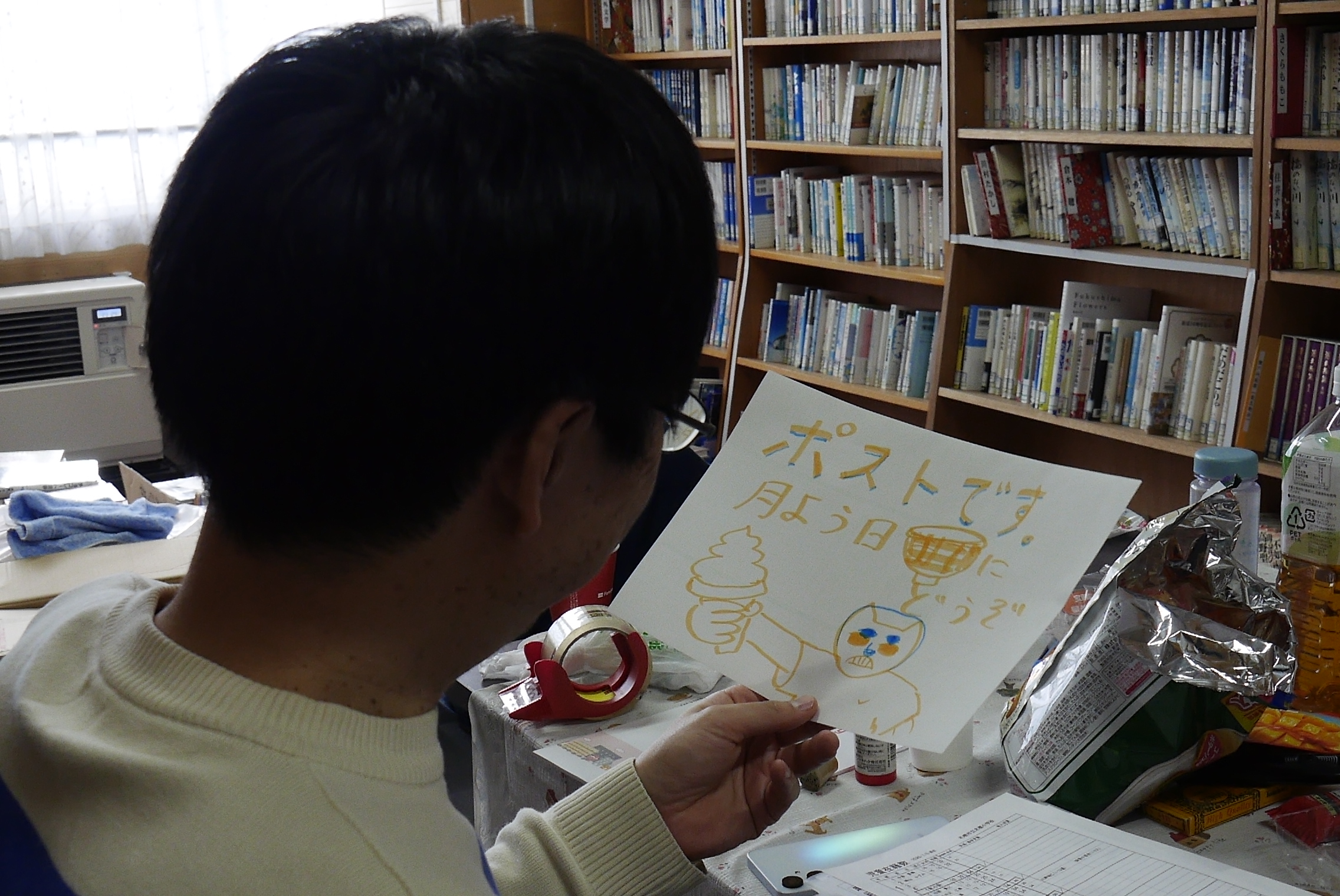 ポスト設置を終えて、一同は開放図書室でひと休み。