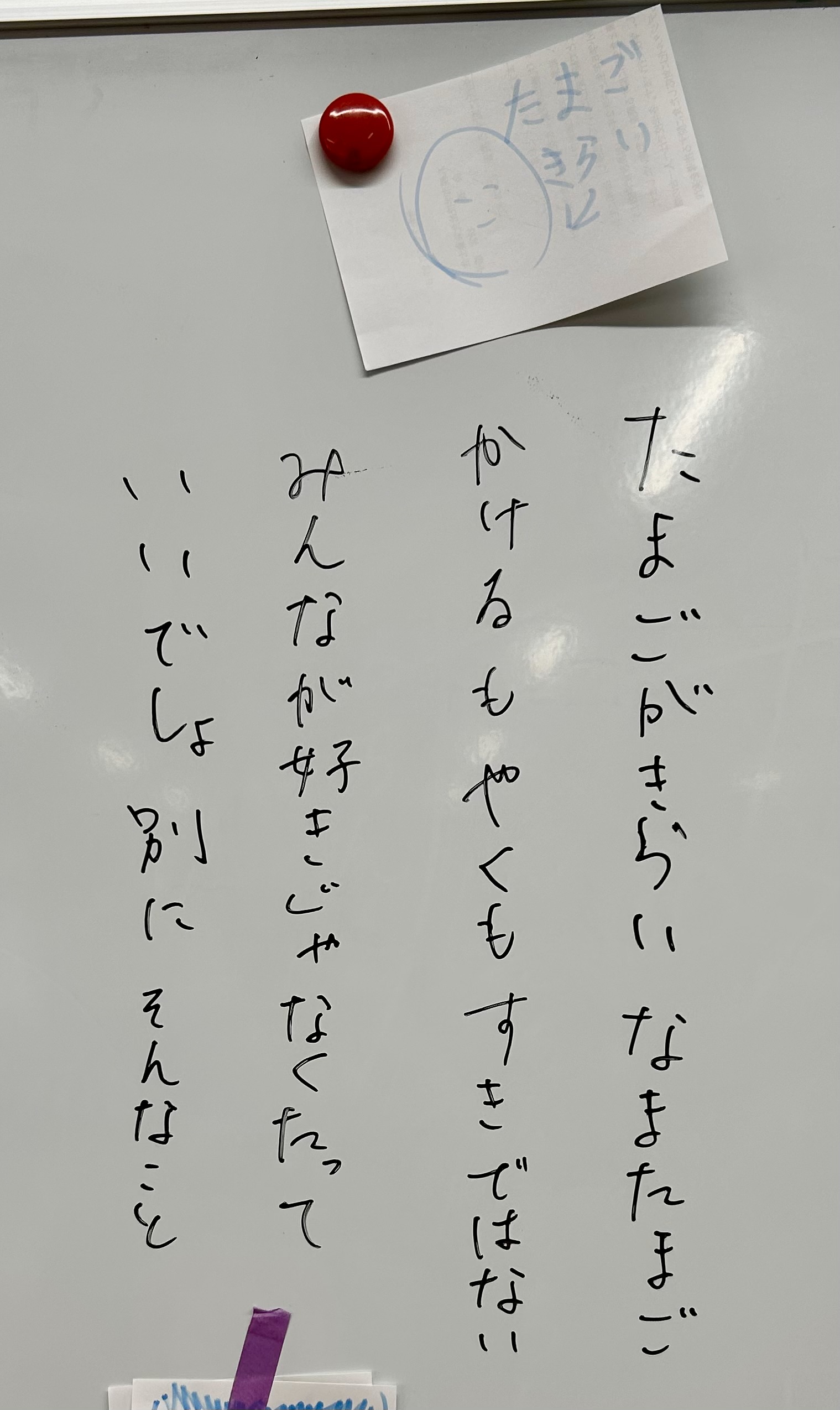 この言葉を編む作業が結構楽しかったです。みんなから遊び道具をもらった感じ。自分は曲歌詞から曲を作ることが多く、「この言葉をどんな音で言ってみたいか」とか「一文字違うだけで浮かぶ情景が変わって面白いな」とか、日本語で遊びながら作っています。それが自分にとっての醍醐味でもあります。だから目の前に広がるみんなの“すきなことば”を見て、ワクワクがこみあげてきたんだと思います。ホワイトボードに書いているときは、ゾーンに入ったみたいに夢中になっていました。ホント楽しかったので、いつかまたやりたいと思います。