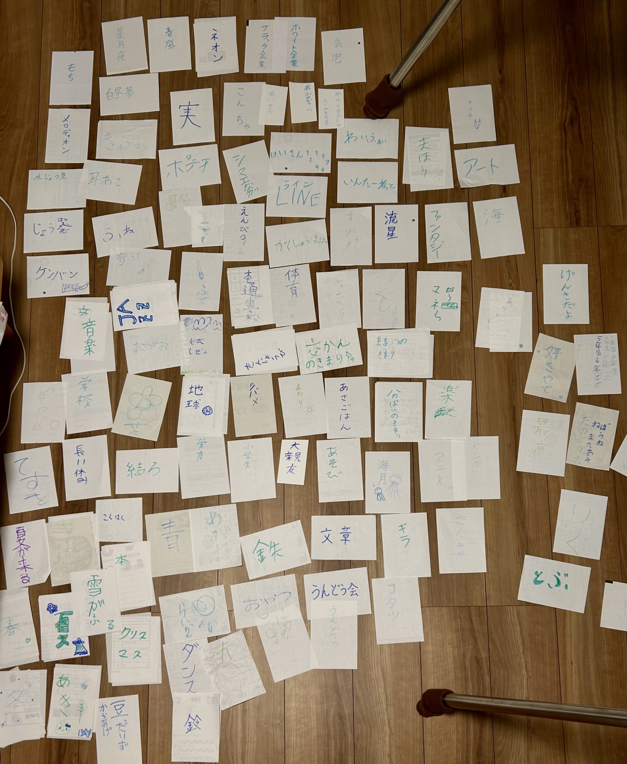 早速もらった言葉をサポーターのメンバーで見ながら、名詞、動詞、形容詞、イラスト、その他にざっくりと仕分け始めてみました。いやー面白い。言葉自体はもちろん、文章やことわざを書いてくれたり、食べ物や名前、キャラクターや推し、歌詞に絵に計算式まで…紙に書いてもらったみんなの“すき”を眺める時間はとても楽しかったです。知らない言葉との出会いはみんなの"すき"を知るきっかけに、知っている言葉との出会いはみんなと"すき"を分かち合う時間になりました。