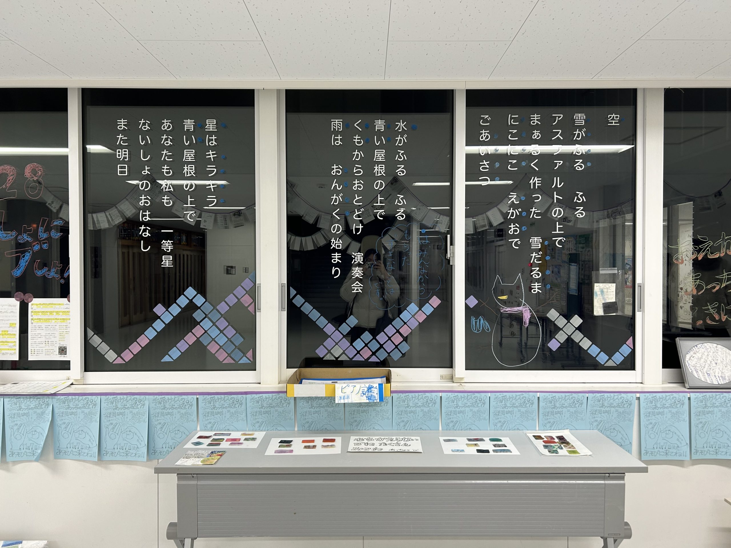 文字が窓に貼ってある。それだけなのに、いつもの場所自体が一つの作品のように感じられました。先生方や子ども達からも「おお!」と感嘆の声が聞こえてきました。