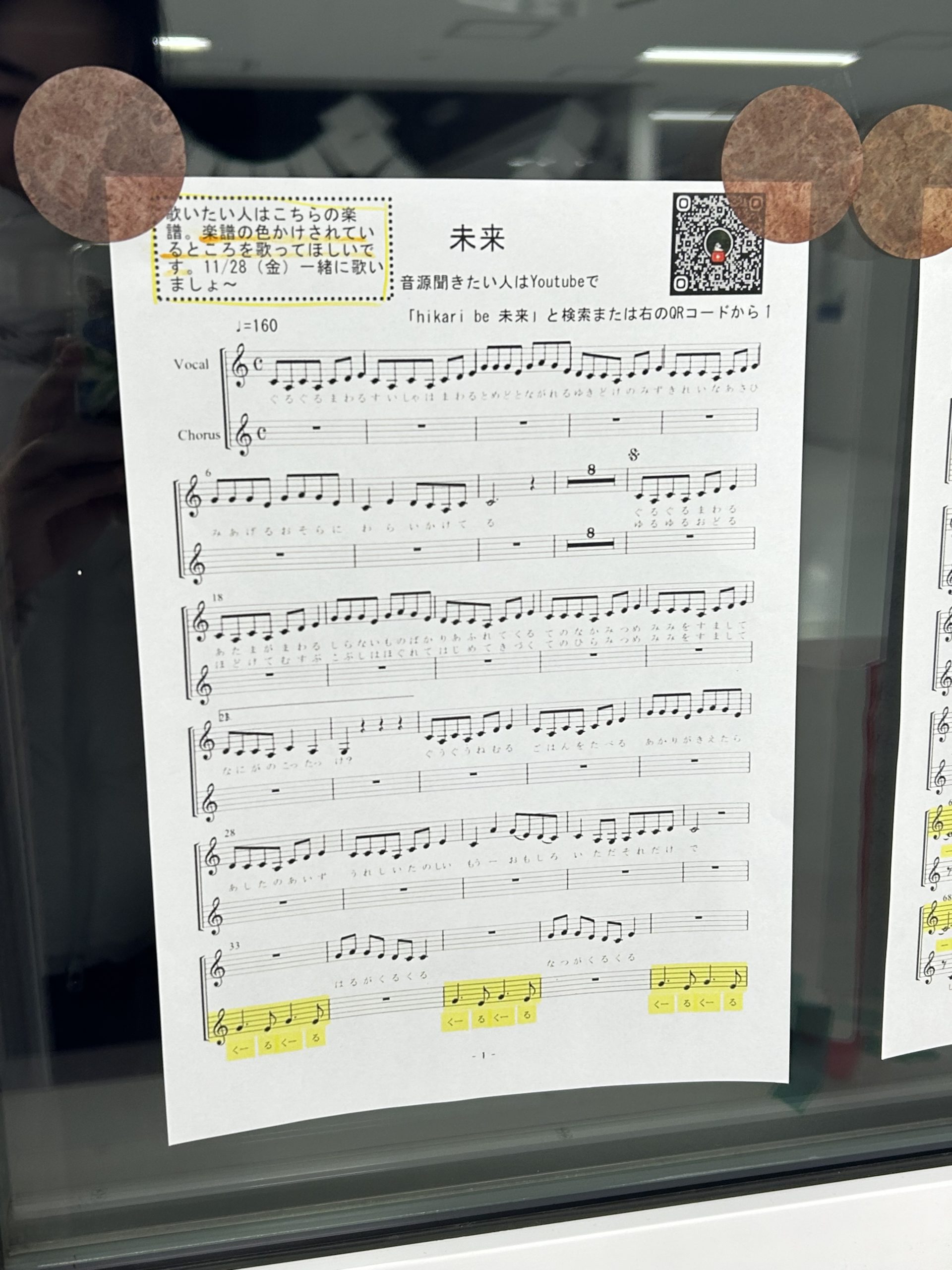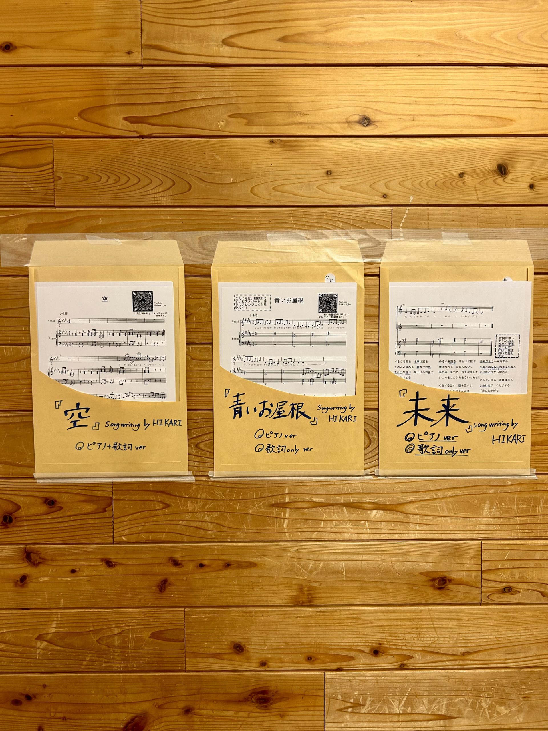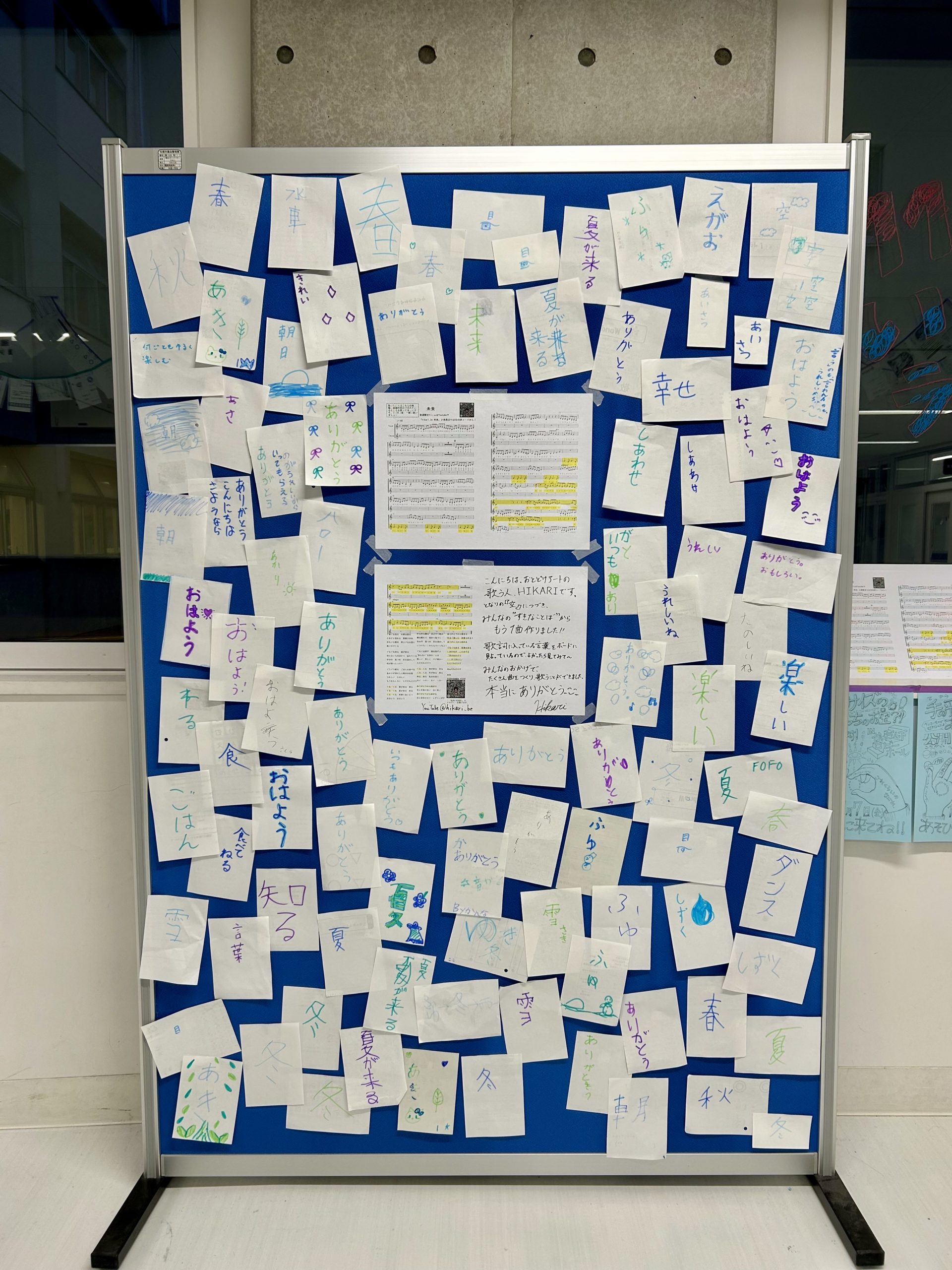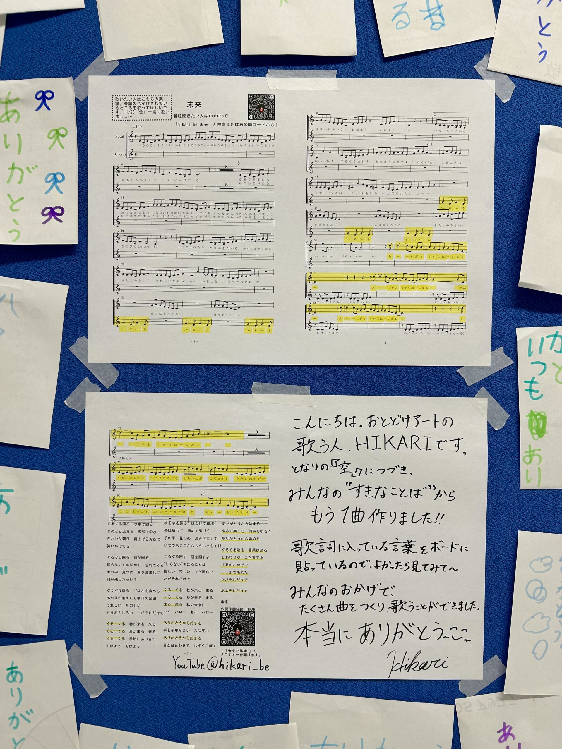 そして本通小学校で披露した「青いお屋根」「空」「未来」の楽譜は、旧校舎の語らいコーナーと多目的室に置かせていただきました。