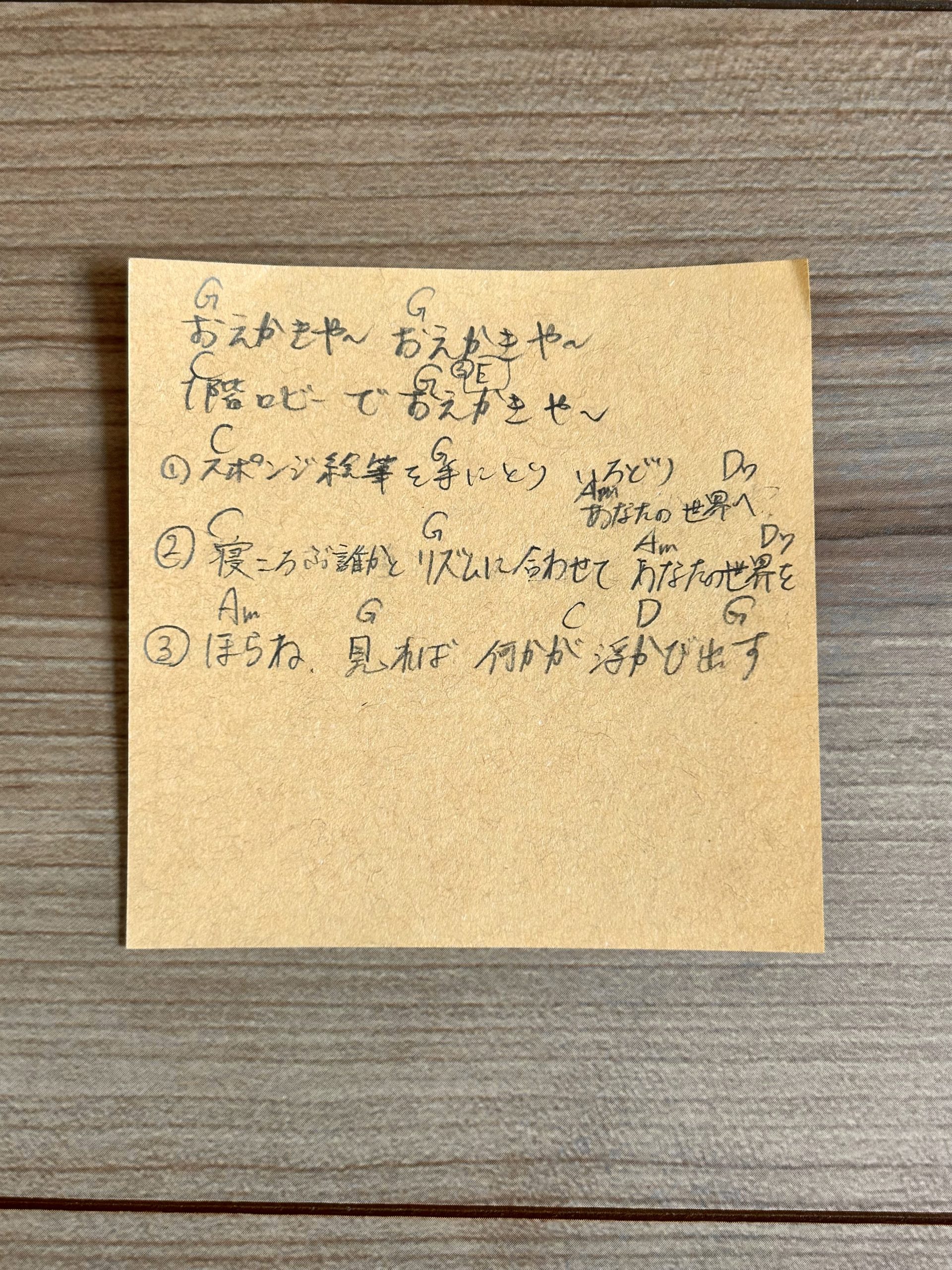 小学校に到着後、作業場で一気にコードを書き上げ、小林さんに小さいものの好きな所を聞いたりしながら完成しました。その時走り書きした楽譜がこちら。