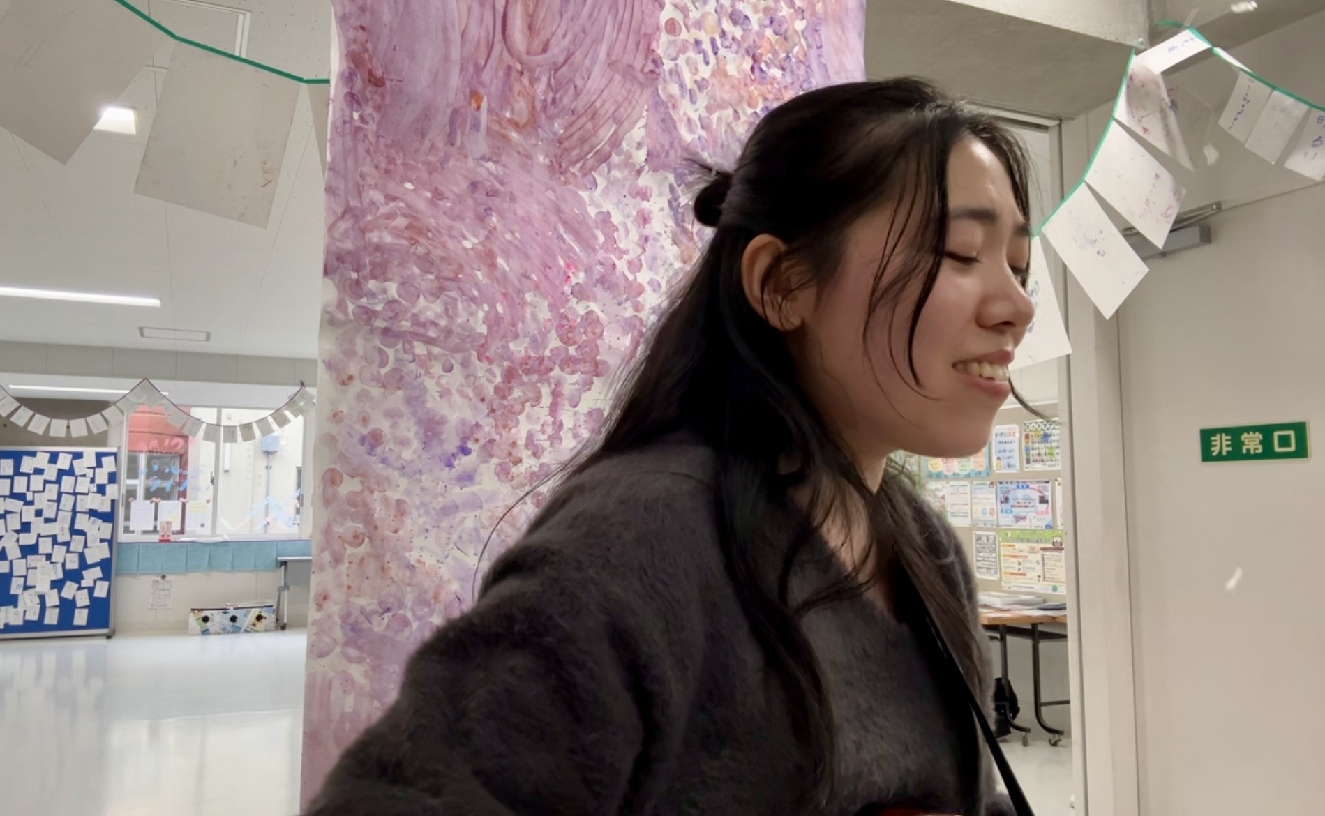 またこの即興性が癖になってしまい、東川下小学校でも進行していた、2mほどの絵筆を使って子ども達に絵を描いてもらうプロジェクトでも歌わせていただきました。