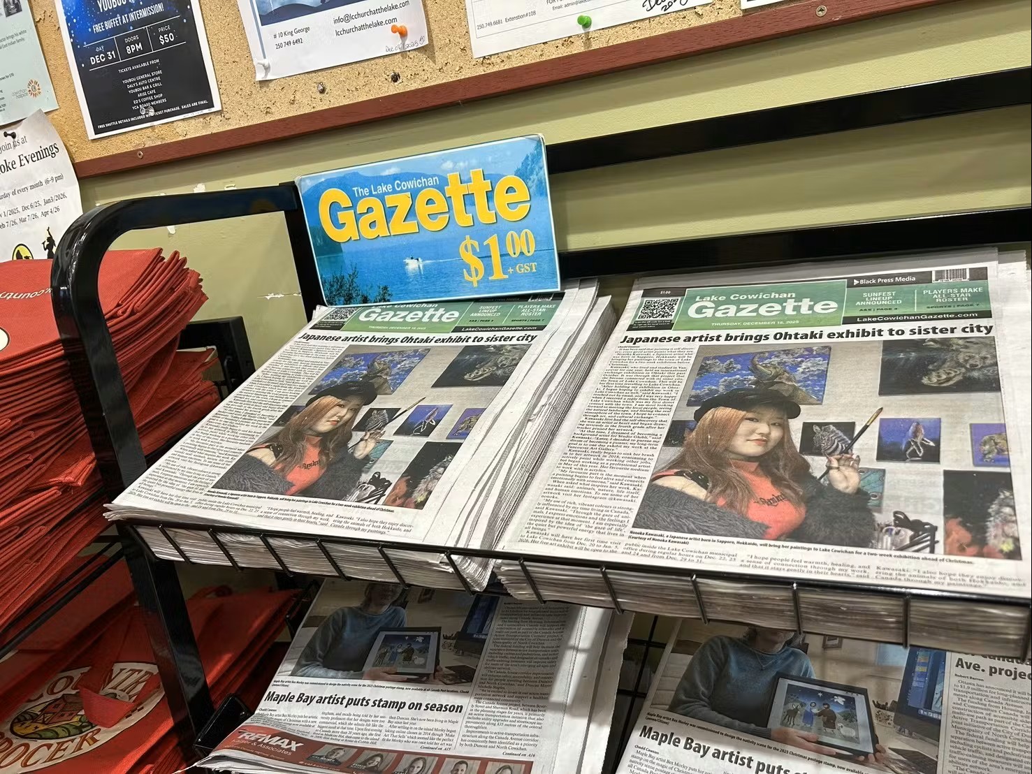 カナダ西海岸レイクカウチン(伊達市大滝区と姉妹都市)のLake Cowichan Municipal office(市役所)にて、作品を展示してきました。期間は2025年12月22日~12月30日。