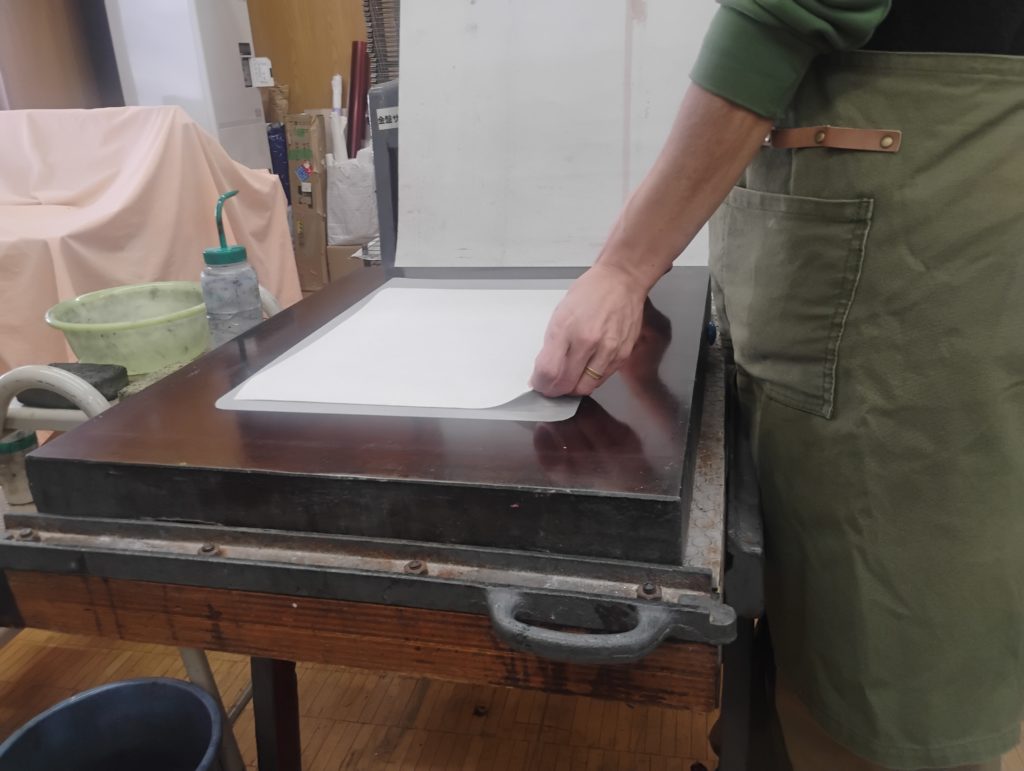 この日、見学に訪れていた人材育成プログラムのメンバーも、プレス機を元の位置まで回す、汚れを都度拭き取る、紙をほどよく湿らせるなど、制作の合間に生まれる細かな作業を手伝いながら現場に関わりました。