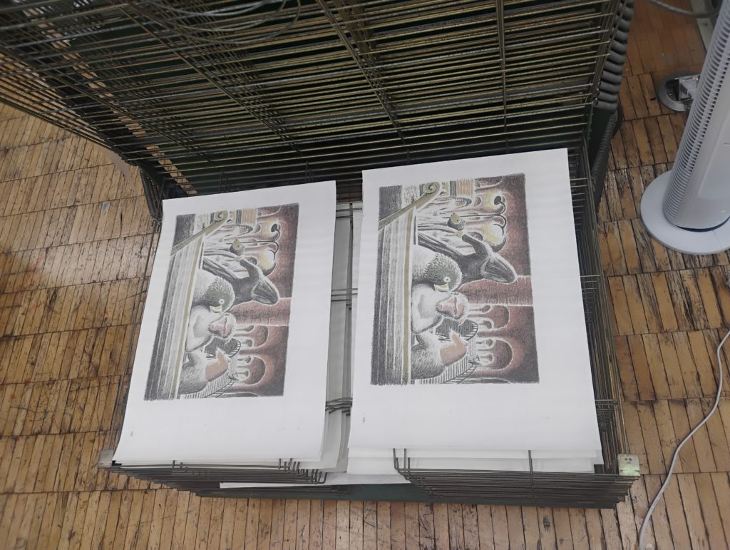 また、制作の合間には、風間さんから小林さんへ版画作品にサインを入れる際のちょっとした豆知識の共有も。A.P.(作家保存用)、T.P.(試し刷り)、H.C.(非売品)、P.P.(刷り師保存用)といったサイン表記の違いについての説明もありました。現場ならではの実践的なやり取りが興味深い場面でした。